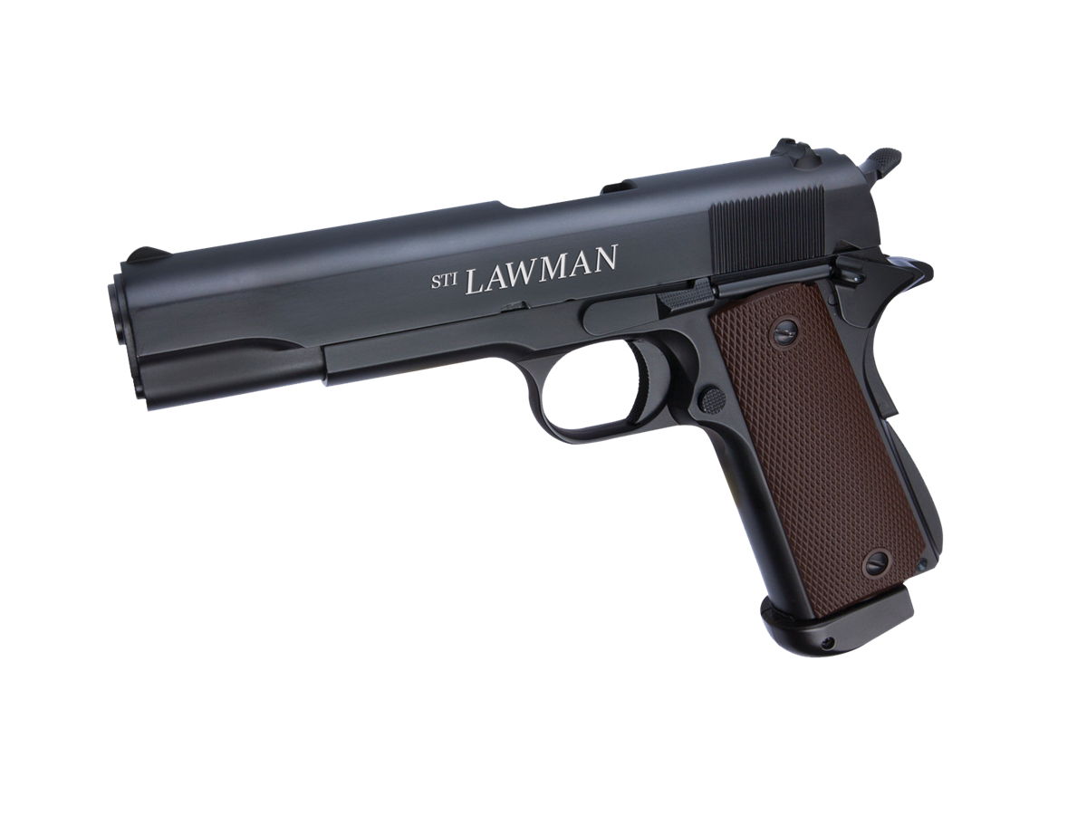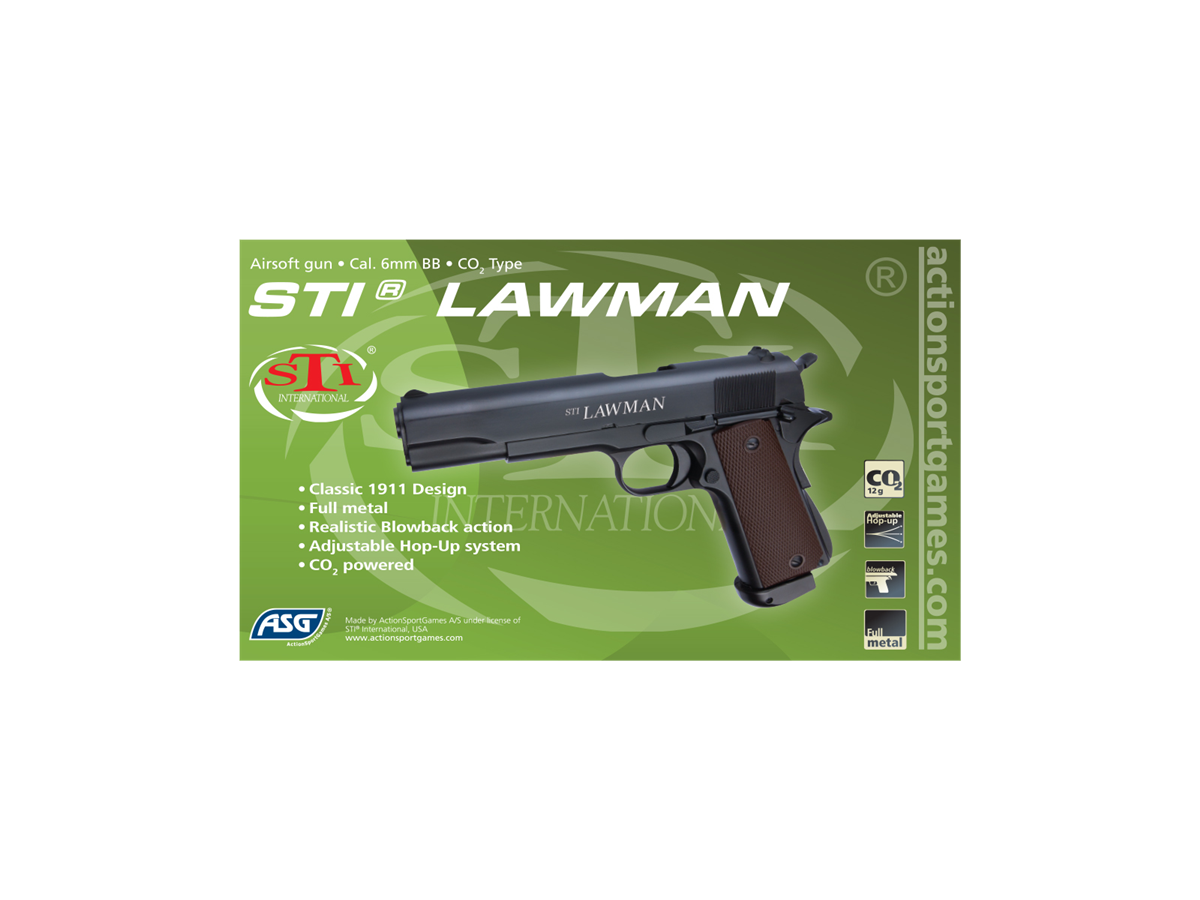 ΠΙΣΤΟΛΙ SOFT GNB, ASG, Co2, STI LAWMAN To STI® International είναι βασισμένο στο κλασικό 1911. Ένα πλήρως λειτουργικό πιστόλι Airsoft με επανόπλιση του κλείστρου σε κάθε βολή. Πλήρως μεταλλικό κλείστρο και σώμα με τα κλασικά σκοπευτικά, την σφήρα και την ασφάλεια του 1911 αυτό το πιστόλι Airsoft που λειτουργεί με αμπούλα CO2 κάνει ένα βήμα πιο πέρα. Αποσυναρμολογείται όπως το αληθινό, για καθαρισμό και συντήρηση. Η αμπούλα διοξειδίου τοποθετείται σε γεμιστήρα που δέχεται και τα πλαστικά μπιλάκια 6mm και τοποθετείται στην λαβή από κάτω.