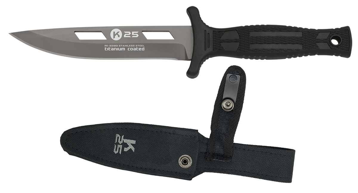 Authors' rights Designed in Spain Brand: K25 Handle: Rubber Blade: Stainless steel (Black cloated) Blade size: 12.4 cm Blade thickness: 4 mm Total size: 23.5 cm Nylon sheath. Quick release
