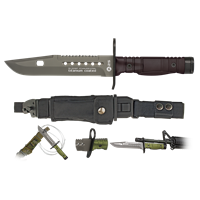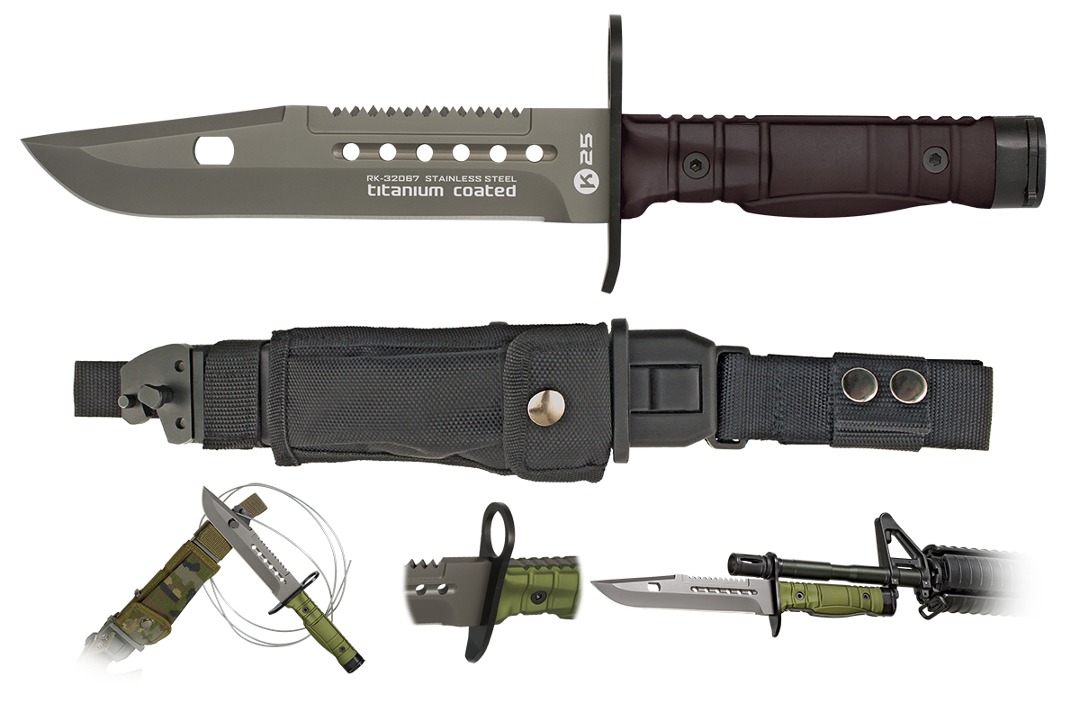Designed in Spain Brand: RUI/k25 Bayonet Handle: Aluminium (rubber coated) Blade: Stainless Steel (Titanium coated) Blade size: 17.8 cm Thickness: 5.5 cm Total size: 30.7 cm Rigid nylon and ABS sheath (Included: Wire-cutter)