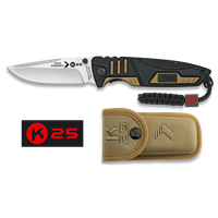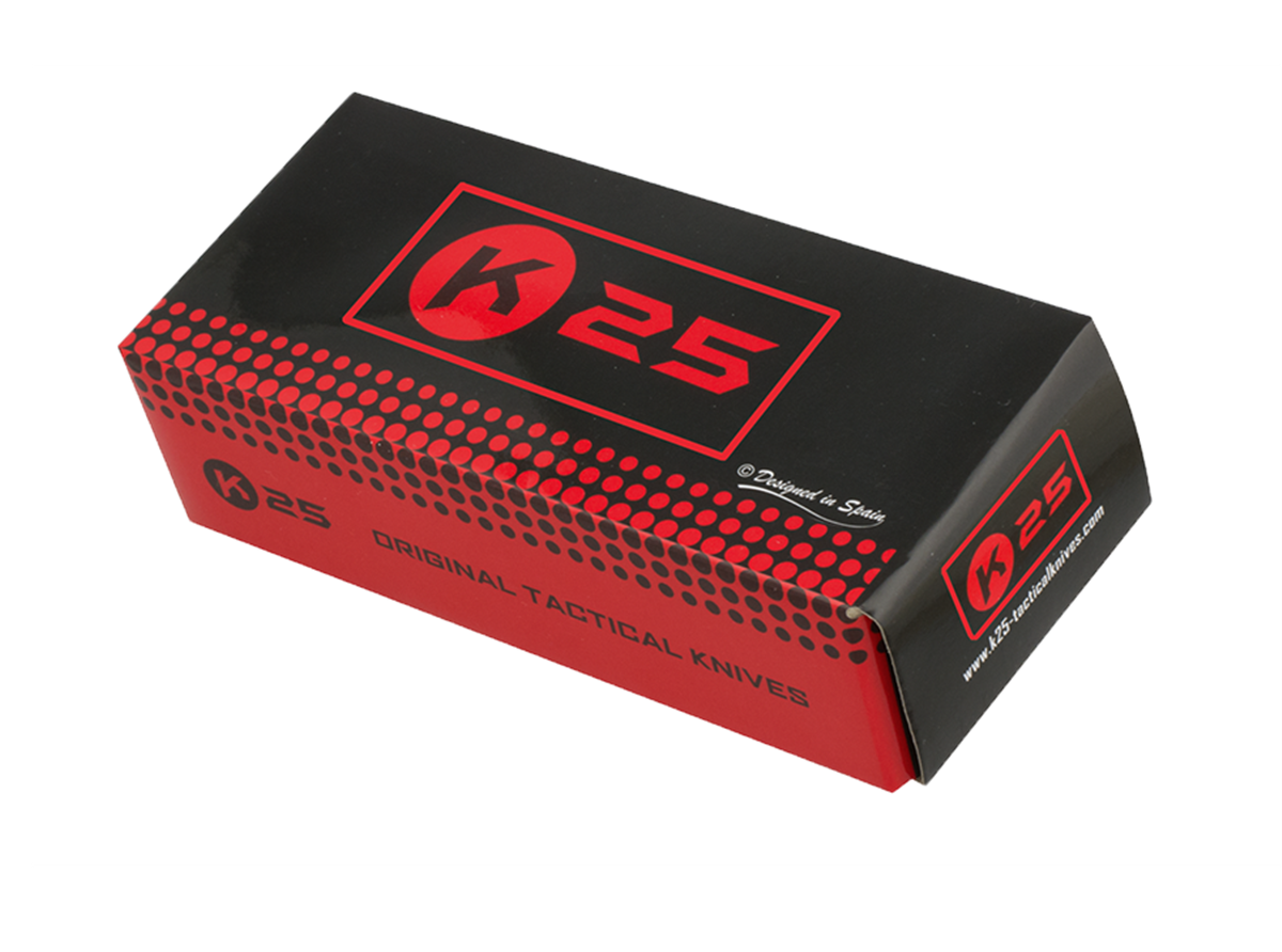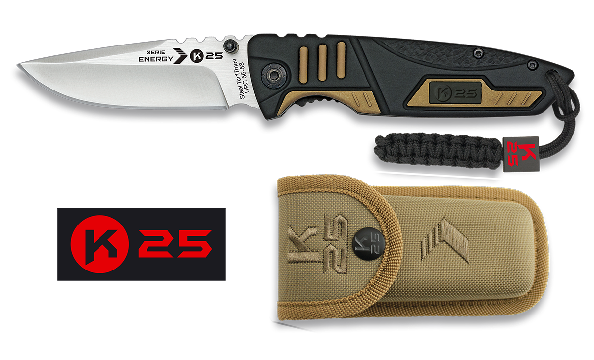 Author's rights Designed in Spain SERIE ENERGY Handle: Aluminium - Rubber coated - Rubber insertions Blade: Stainless Steel 7cr17 mov HRC 56-58 Blade size: 8.5 cm Blade thickness: 3.8 mm Nylon pouch