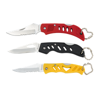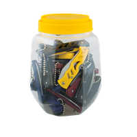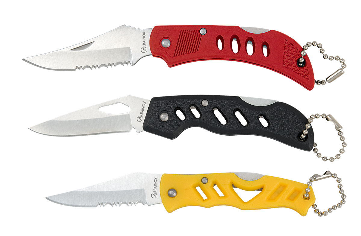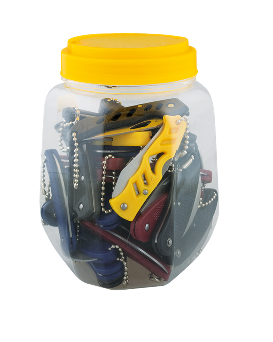 Τιμή μονάδας σε συσκευασία 36 τεμαχίων Assorted can. Includes 36 pocket knives: - Yellow (5.4 cm blade) - Black (5.5 cm blade) - Red (6 cm blade) All knives with PVC handles and strings.