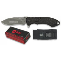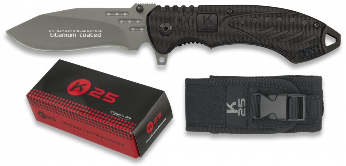 Μάρκα: K25 Λαβή: G11 Λεπίδα: Ανοξείδωτο ατσάλι (επικαλυμμένο με τιτάνιο) Μέγεθος λεπίδας: 9,4 cm Πάχος λεπίδας: 4 mm Περιλαμβάνει κλιπ Παρουσίαση: Θήκη από νάιλον