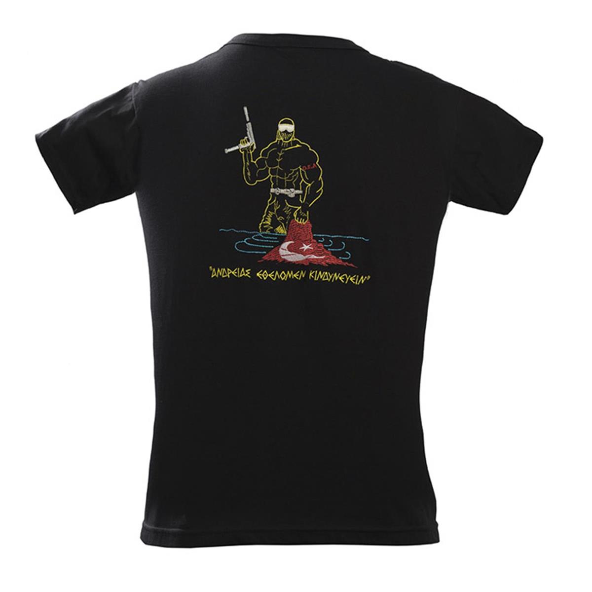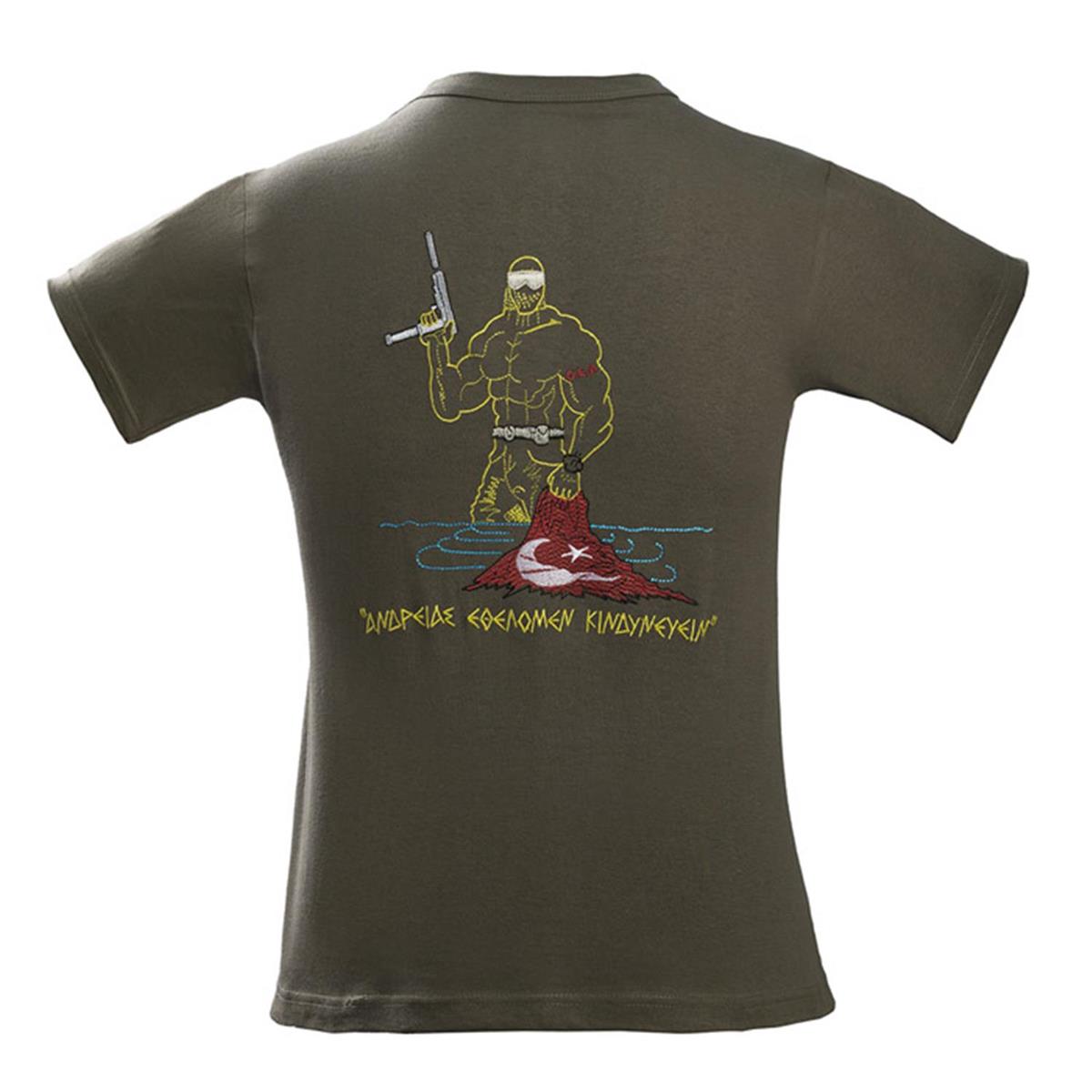 Mπλουζάκια με μεγάλες κεντητές στρατιωτικές παραστάσεις στην πλάτη με σήμα μπροστά και σημαία στο μανίκι O.E.A. Tούρκικη σημαία.